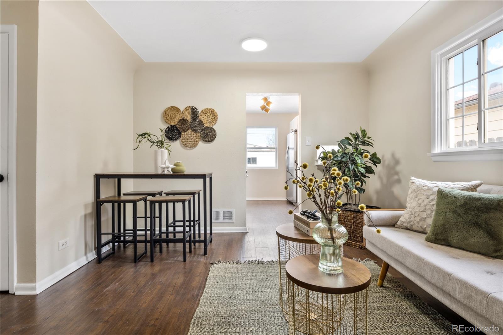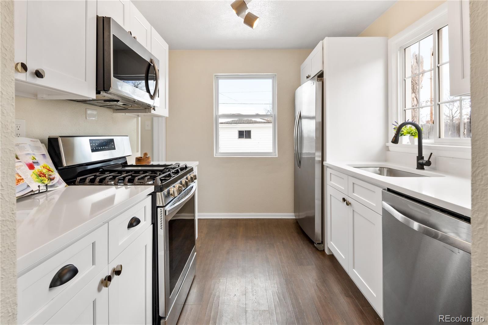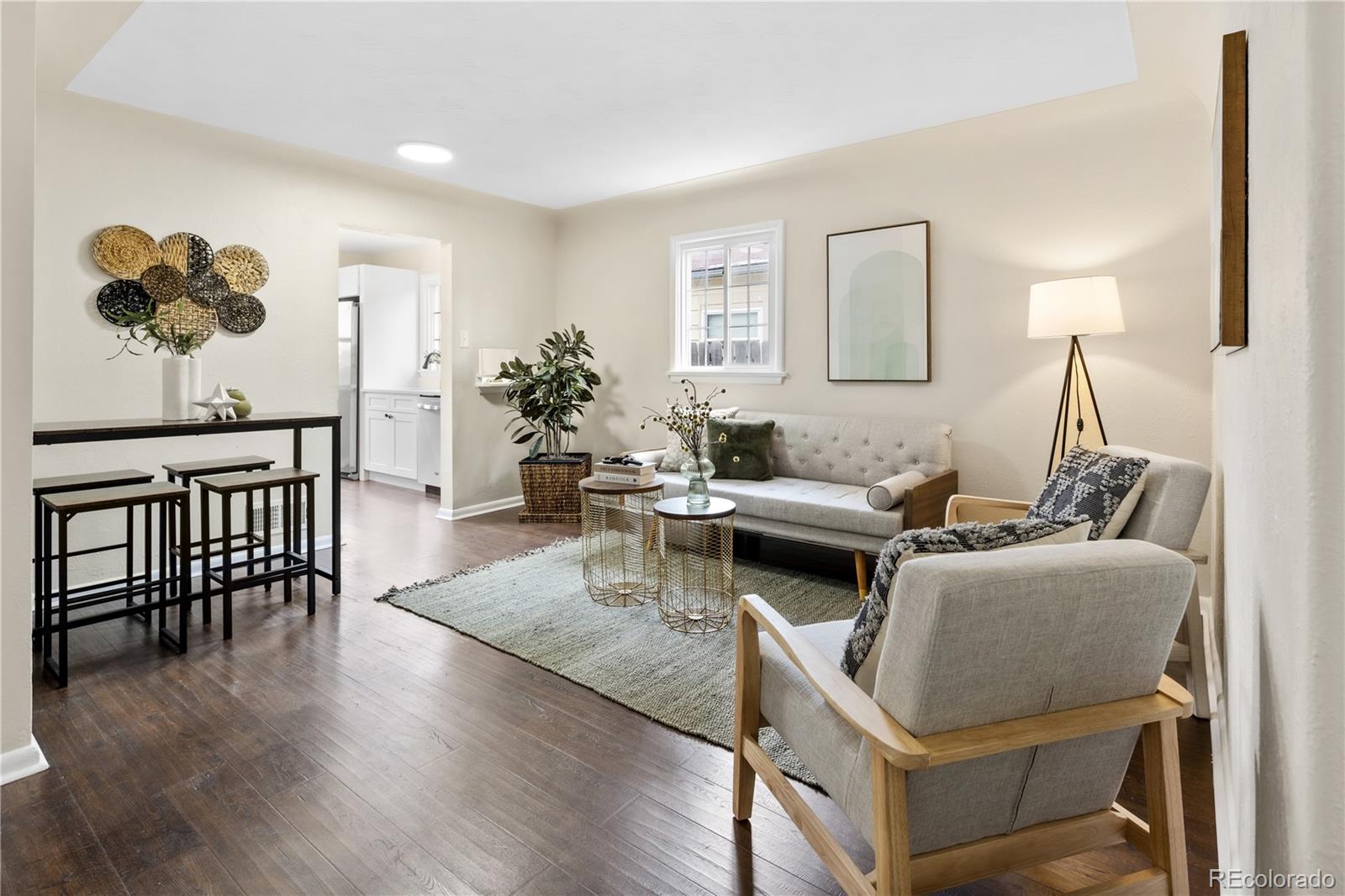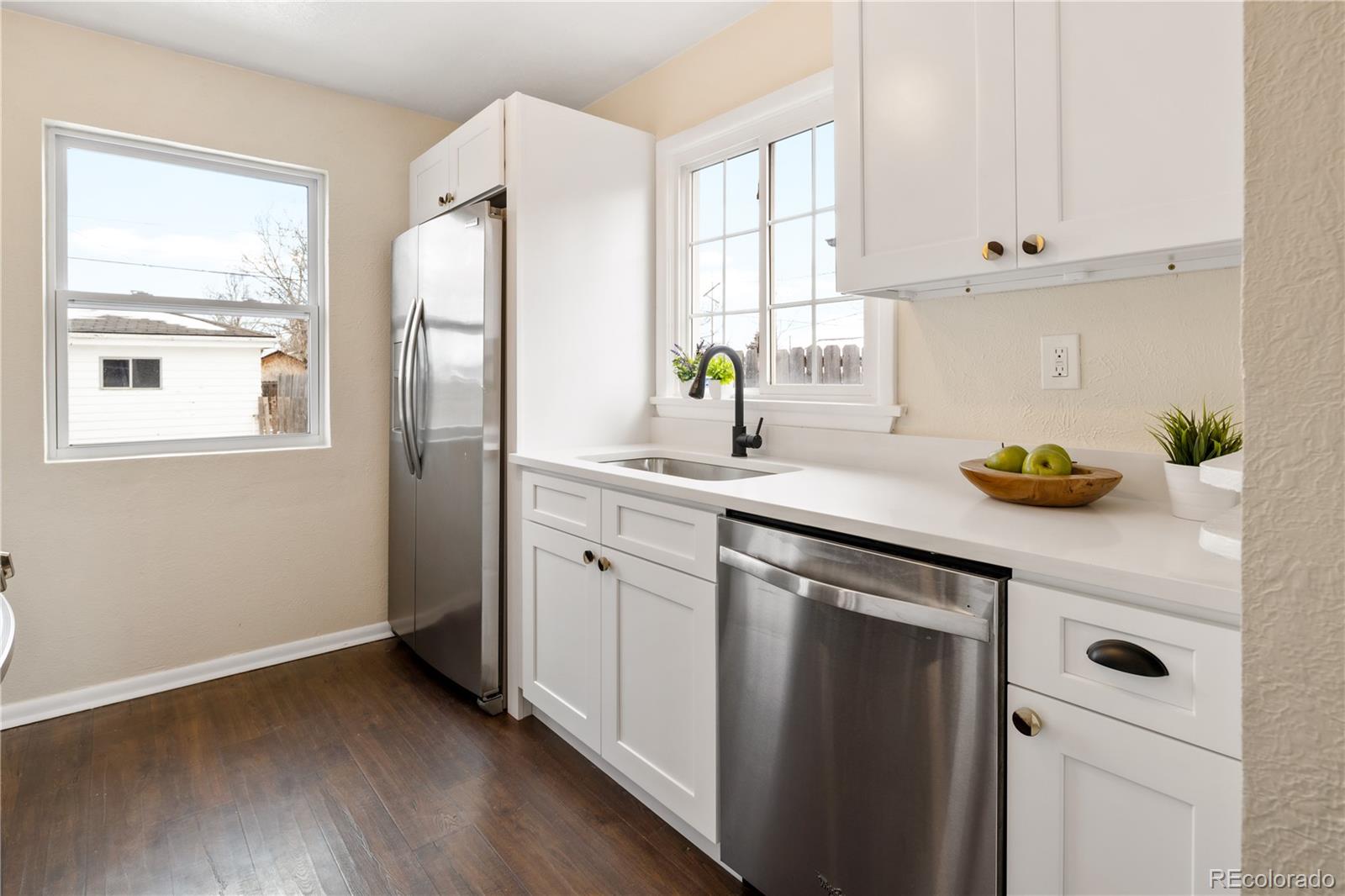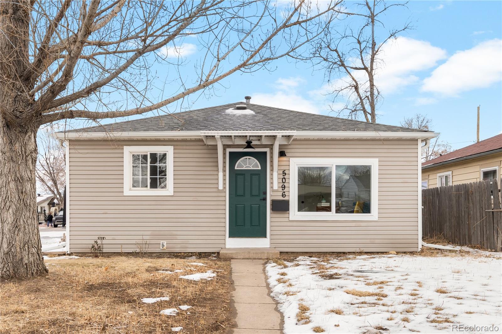 Welcome to Elyria Swansea, one of Denver's most storied neighborhoods. This charming ranch sits on a large corner lot and has so much to offer. Step into a completely remodeled interior space, where modern touches blend with midcentury charm. The design is a blend of warm clean touches with a pop of dark hardwood floors underfoot. Hand sculpted coved ceilings eliminate echo and invite visitors to stay a while and share a conversation. There is so much new in this home, from double pane windows, shaker cabinets to trendy tile, upscale hardware and LED lighting. With three bedrooms and one bathroom this home invites you to say goodbye to renting and embrace ownership. Big picture windows throughout allow for the abundant Colorado sunshine to fill and warm the space. Enjoy cooking in the stylish updated kitchen with white cabinets, chic quartz counters and stainless steel appliances. The bathroom has been completely redesigned with all new tile, black hardware, new bathtub/shower, wood vanity and sconce lighting. The large laundry room (washer and dryer included) has a utility sink and leads to a spacious fenced backyard, offering a perfect blend of convenience and flexibility. Bring the fur babies and your green thumb to enjoy this expansive private oasis. The detached 1.5 car garage is oversized with shelves and room for storage plus more parking in the driveway. Roof is five years old and water heater is newer. This home is conveniently located about five minutes from I-70 ensuring quick access to downtown, DIA, the mountains and all the trendy spots in Denver. One block to the East is a large community park, and just a few blocks to the south is the brand new I-70 Cover Park with huge soccer pitch, playgrounds and more. Just a quick drive to grocery stores, shopping and local restaurants. Visit www.5096stpaul.com for more. Seller to install new sewer line upon successful Closing. Se Habla Espanol.
